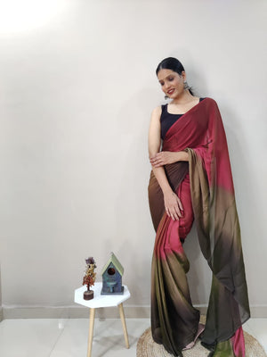 1-Min Ready To Wear Dark Coffee Imported Silk Saree With Blouse