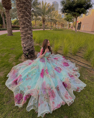 Beautiful Flower Print Sky Blue Organza Silk Lehenga Choli