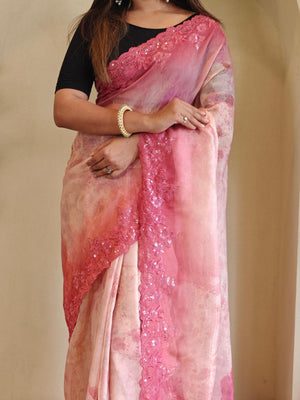 🥻👉🏻Description - Hand crafted magic gold organza sarees with all over digital print and viscose - sequins embroidery on the saree with rich embroidered pallu.