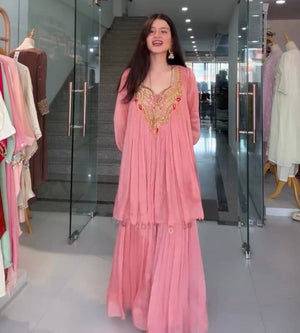 Designer Chinon Embroidered Kurti Sharara Set