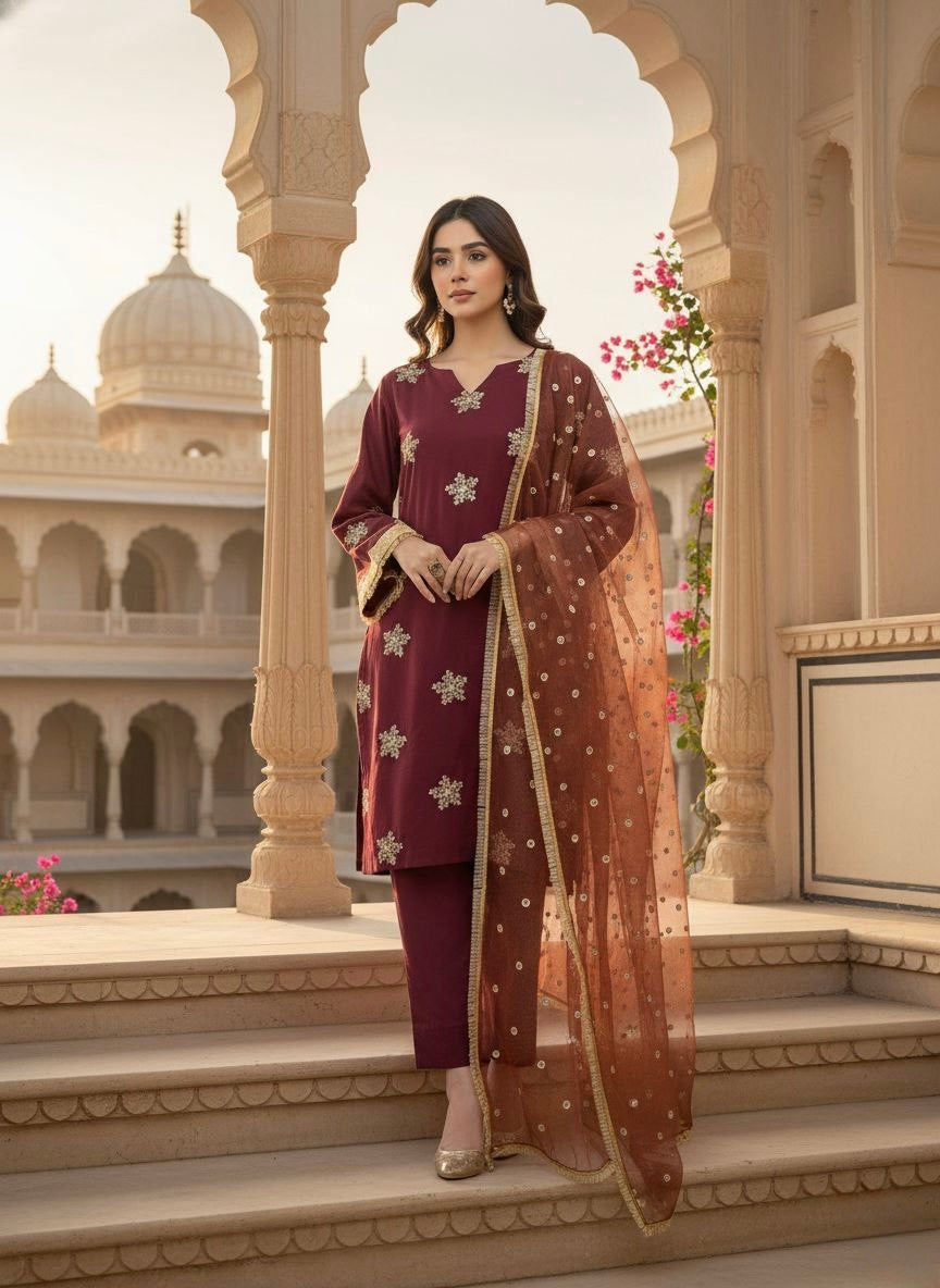 Presenting a newly launched designer ready-to-wear collection crafted in elegant natural crepe silk. This stylish three-piece set includes a fully stitched top, comfortable pant, and a lightweight dupatta, designed to offer everyday elegance with premium comfort. Perfect for casual gatherings, festive wear, and daily ethnic styling.