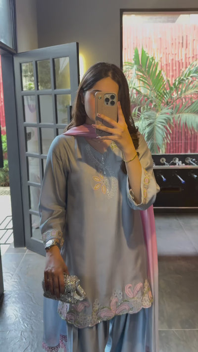 Presenting a newly launched designer party-wear ensemble featuring a beautifully crafted top paired with a farshi salwar and matching dupatta. Designed in rich satin silk with elegant embroidery, this fully stitched set offers a graceful silhouette and festive appeal, perfect for special occasions.