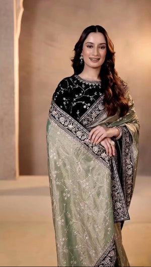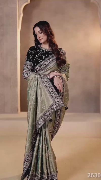 Add timeless elegance to your ethnic wardrobe with this evergreen designer saree from RV Creation. Crafted in premium soft Mocha silk, this saree features intricate silver zari and 3mm sequins jaal embroidery, beautifully finished with velvet fabric lace borders and zari dori detailing. Perfect for festive occasions, weddings, and special celebrations, this saree blends classic charm with modern craftsmanship.