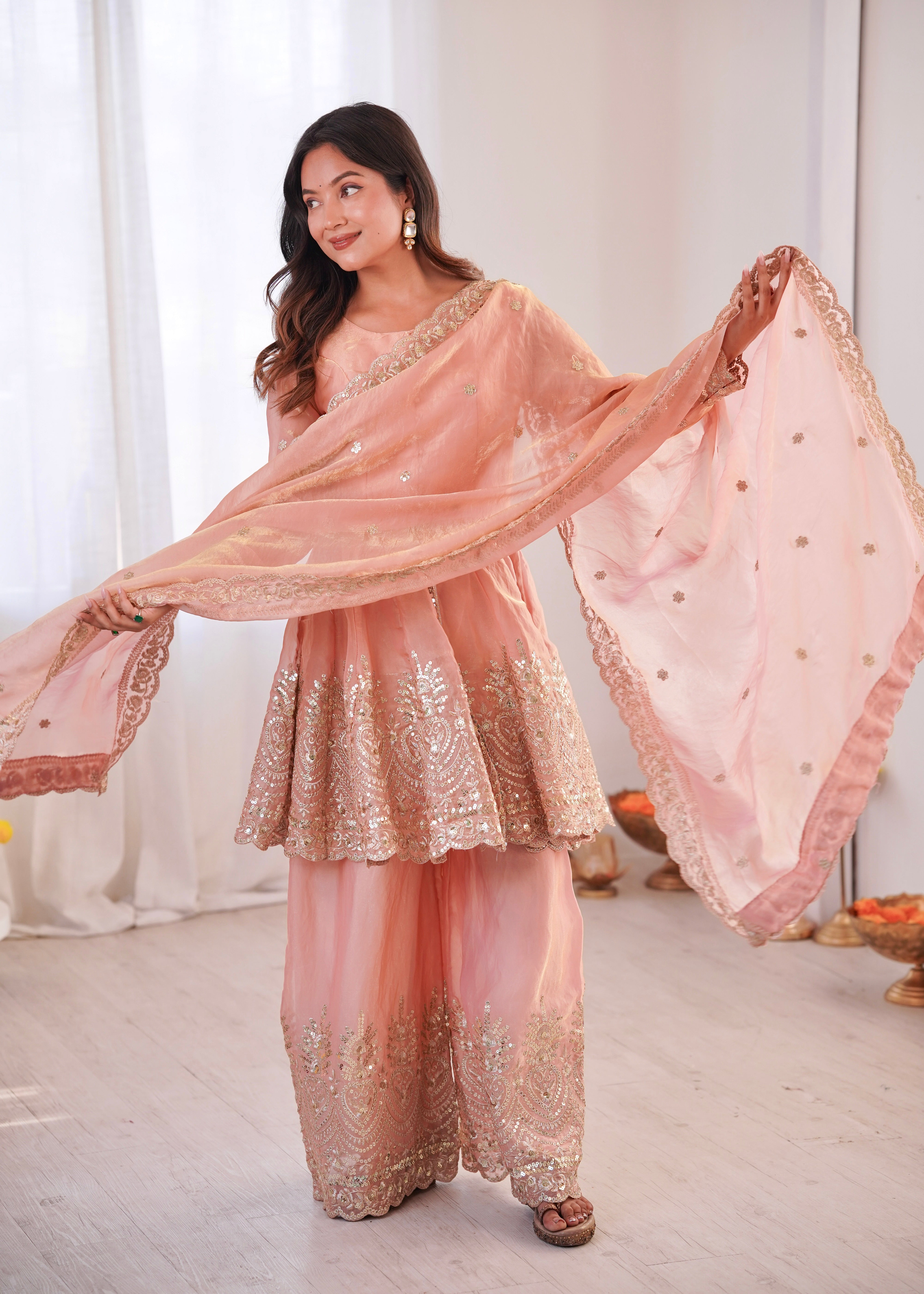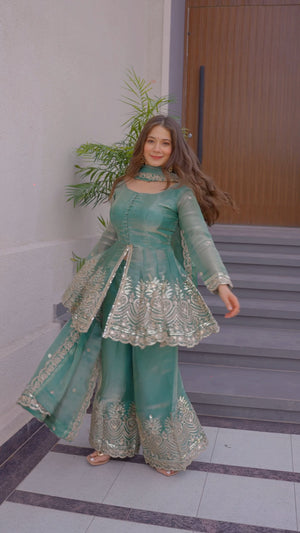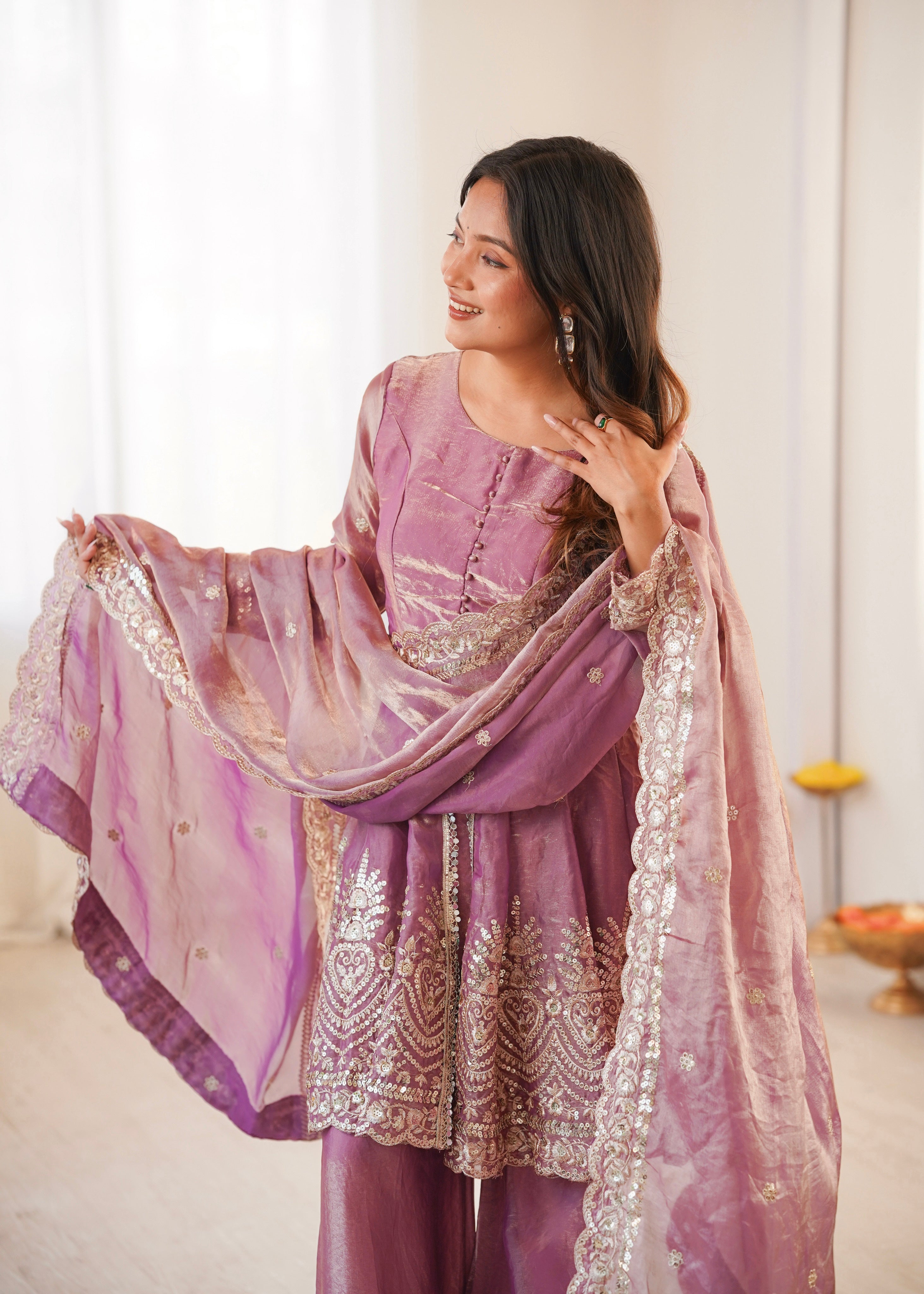 Designer Two-Tone Fandy Silk Top Palazzo Set with Embroidery & Dupatta