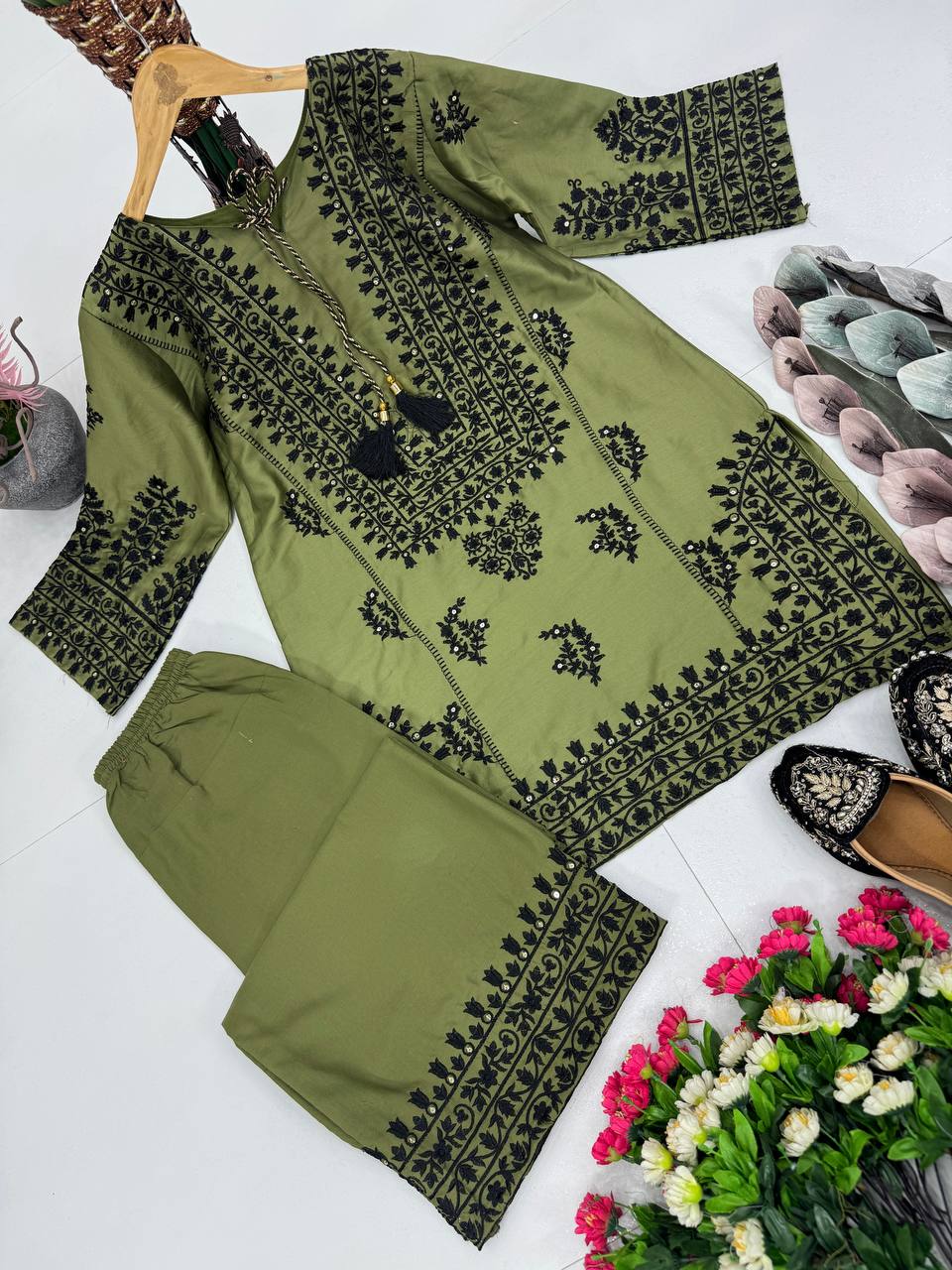 Embroidery With Sequence Work Mehndi Color Co-ord Set