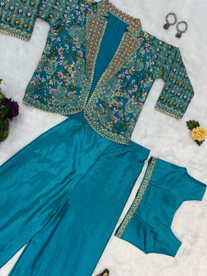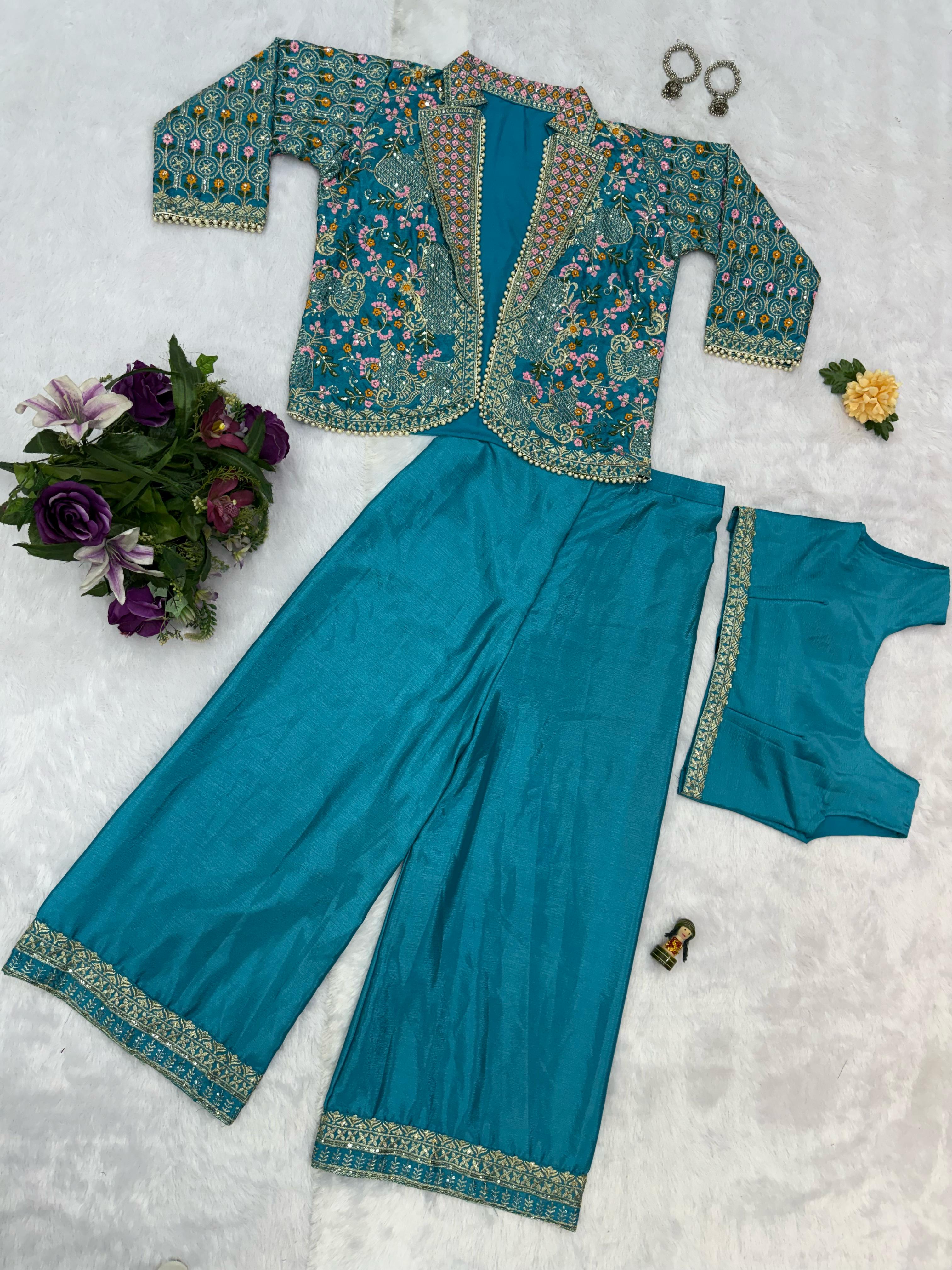 Flattering Chinon Teal Blue Color Palazzo Top With Koti