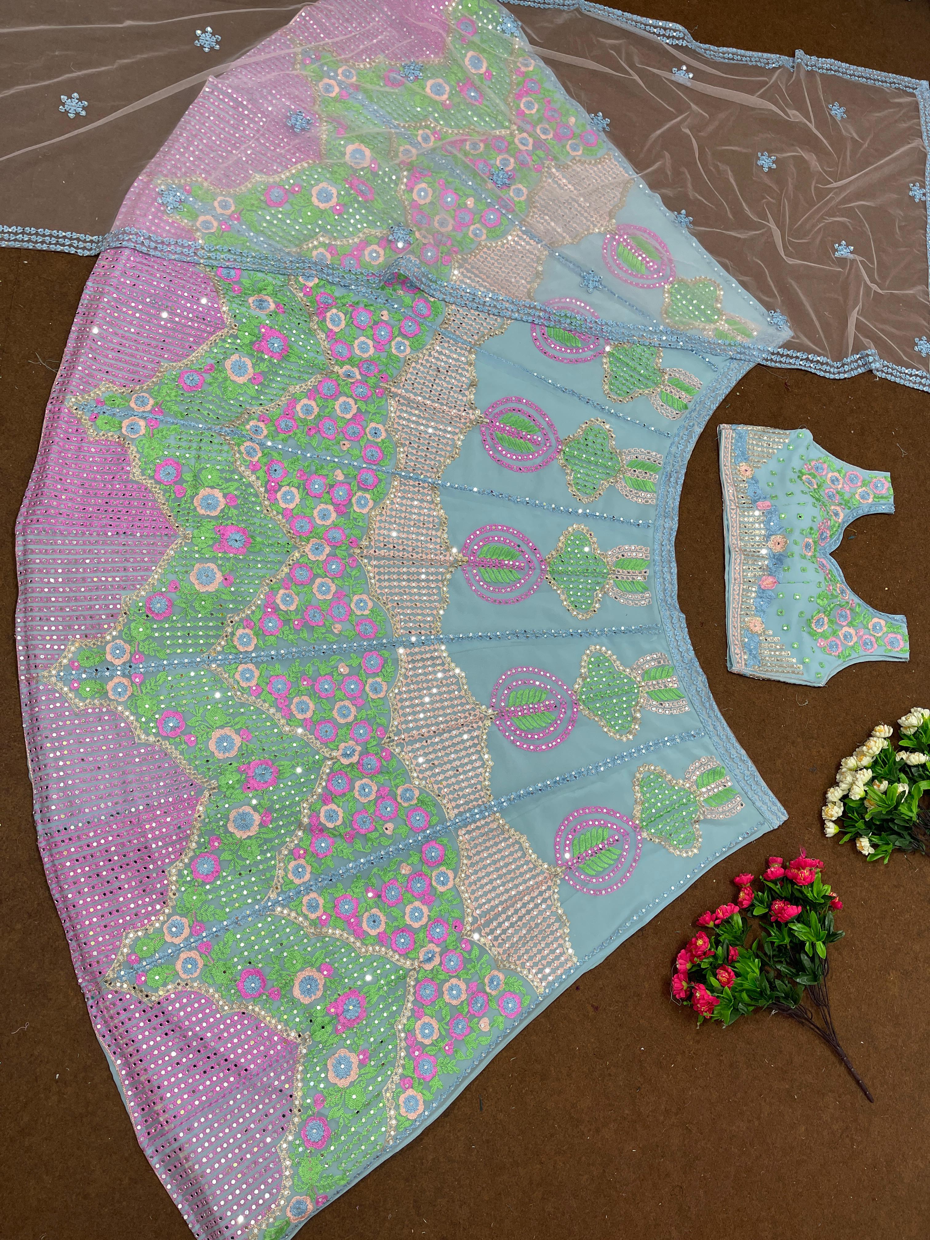 Function Wear Multi Thread Work Sky Blue Lehenga Choli