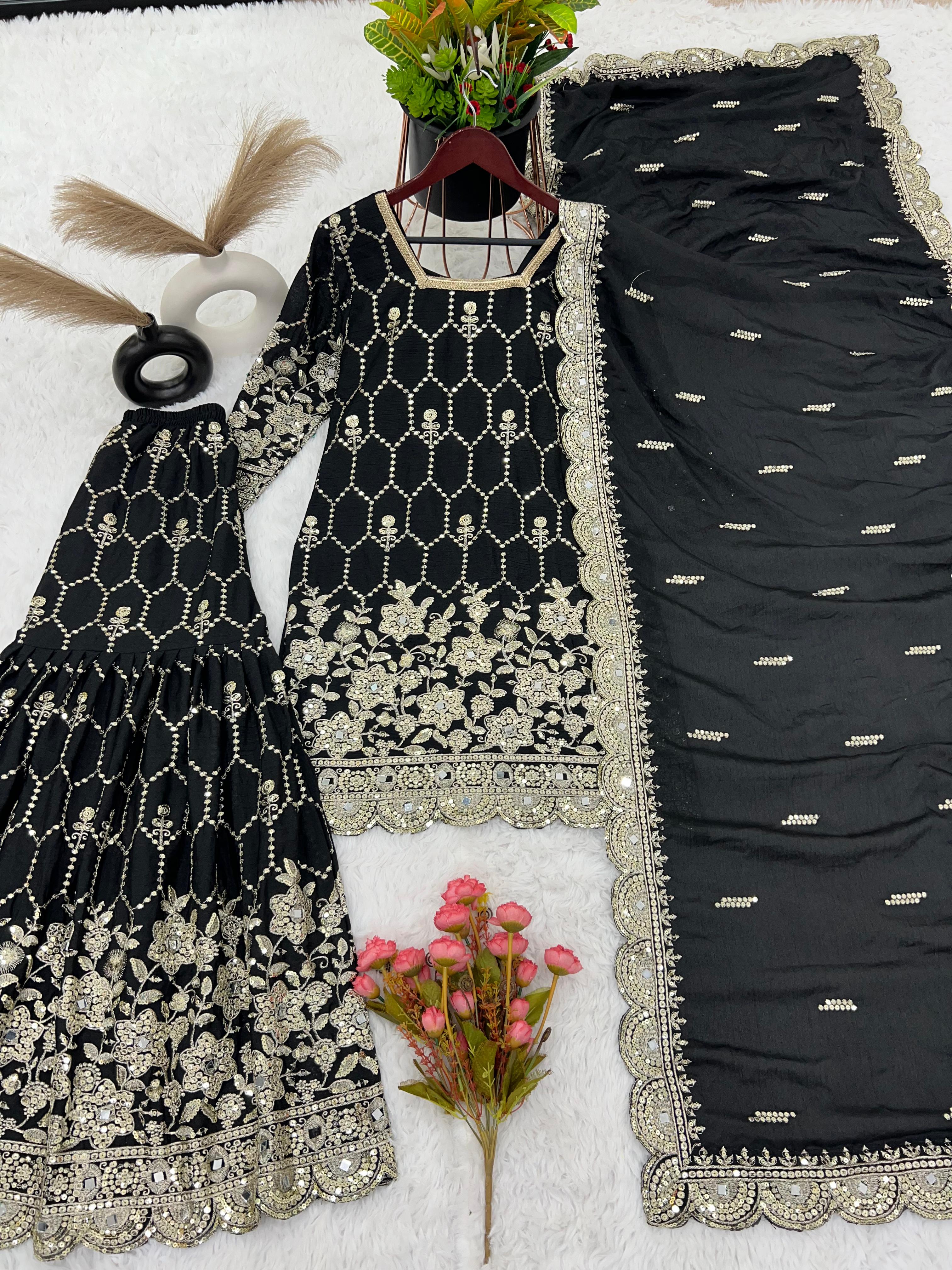 Gorgeous Embroidery Sequence Work Black Color Sharara Suit
