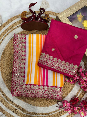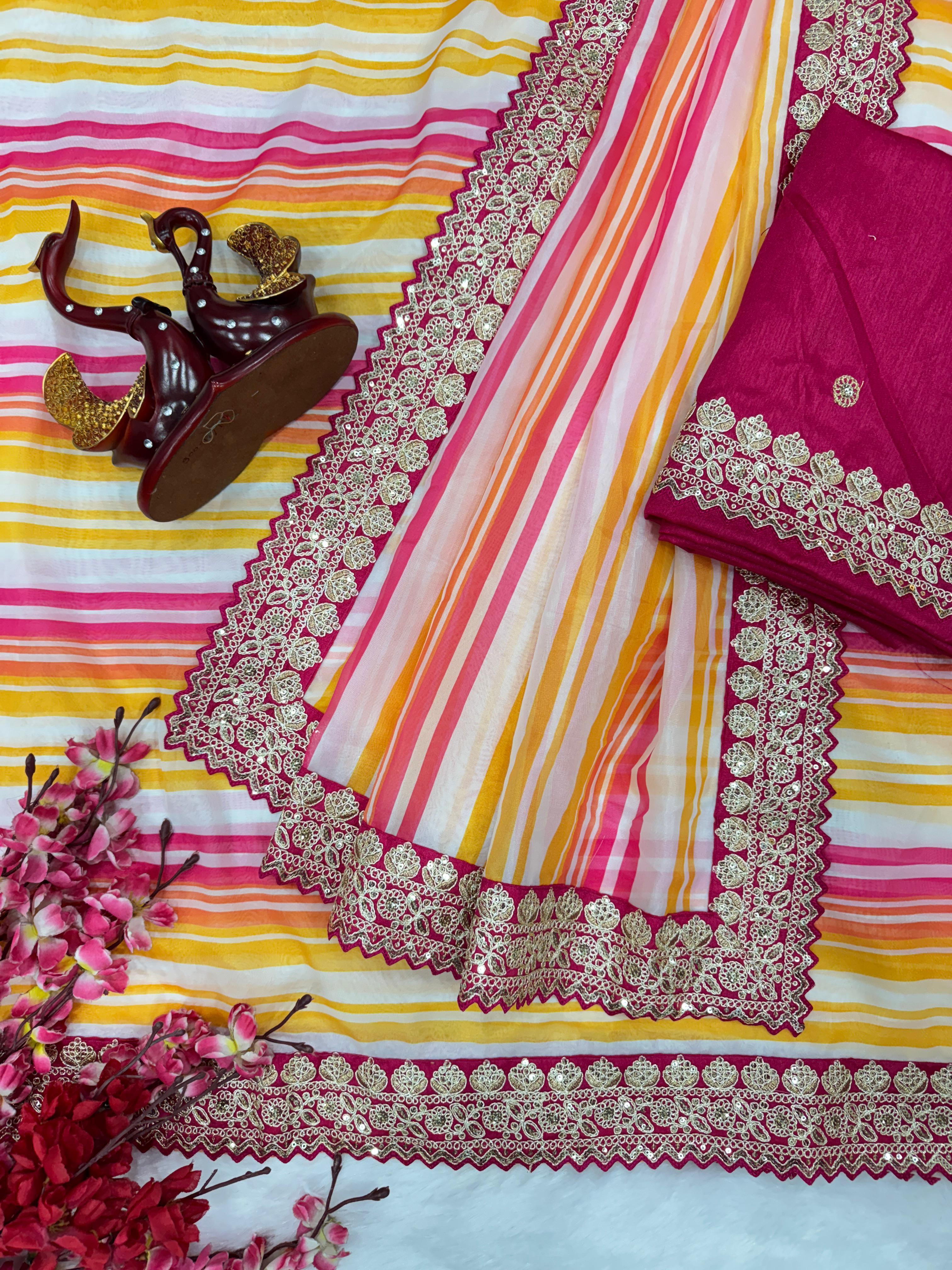 😍Unveil your inner fashionista with our stunning pink leheriya designer saree paired with the most sought-after Embroidery blouse in rich pink.