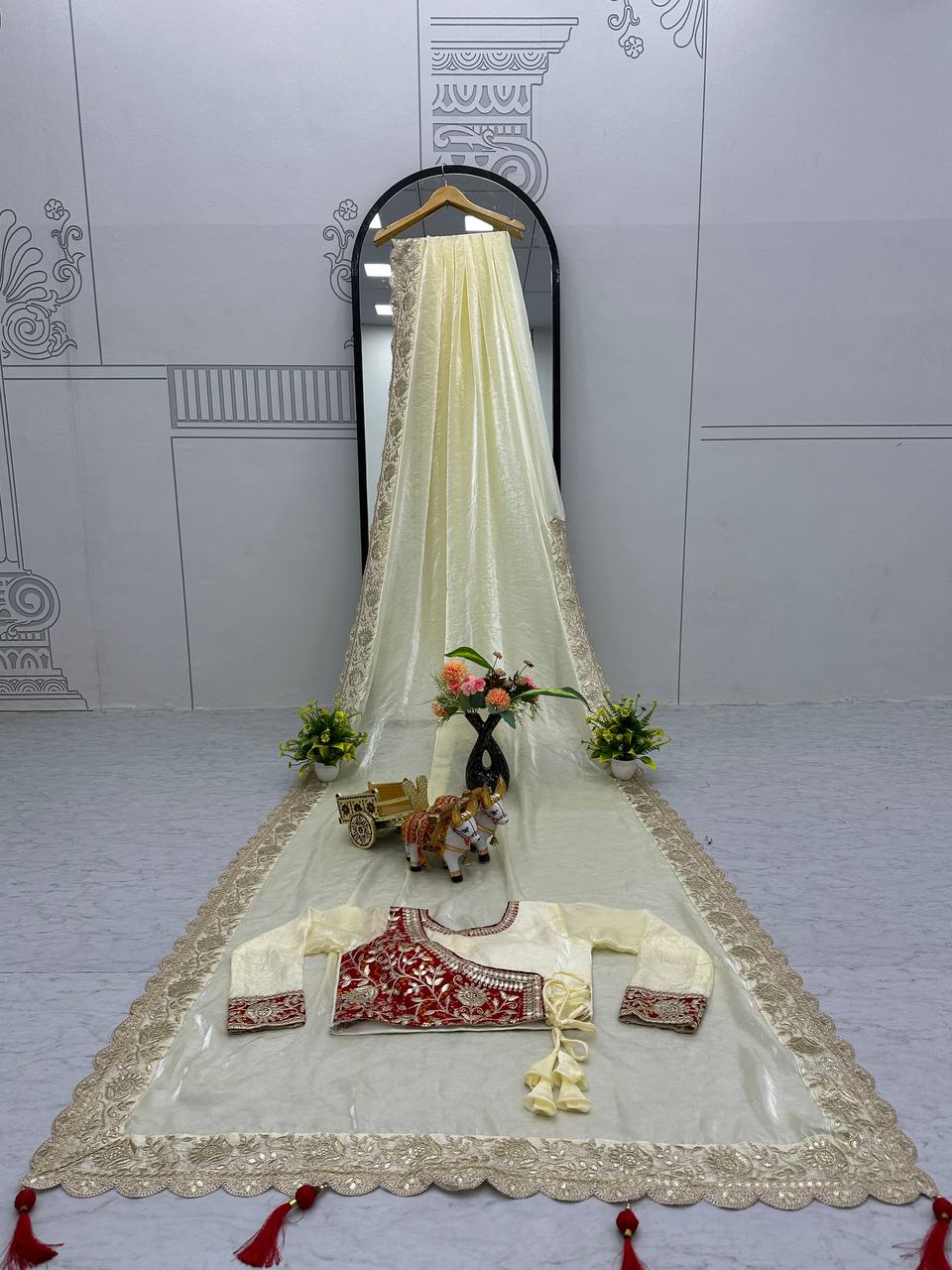 Occasion Wear Gota Pati Work Off White Color Saree With Red Blouse