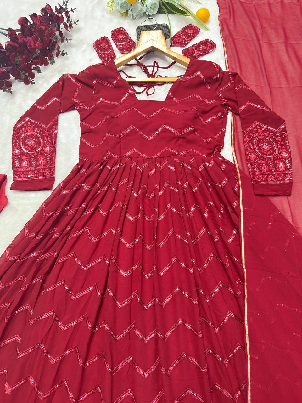 Party Wear Embroidery Work Red Color Anarkali Suit