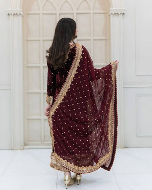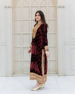 Premium Viscose Velvet Embroidered Top–Bottom–Dupatta Set | Fully Stitched