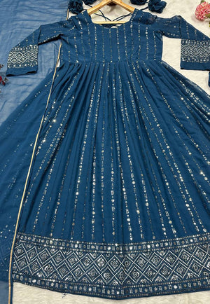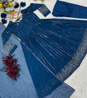 Ravishing Rama Blue Faux Blooming Work Anarkali Suit With Palazzo