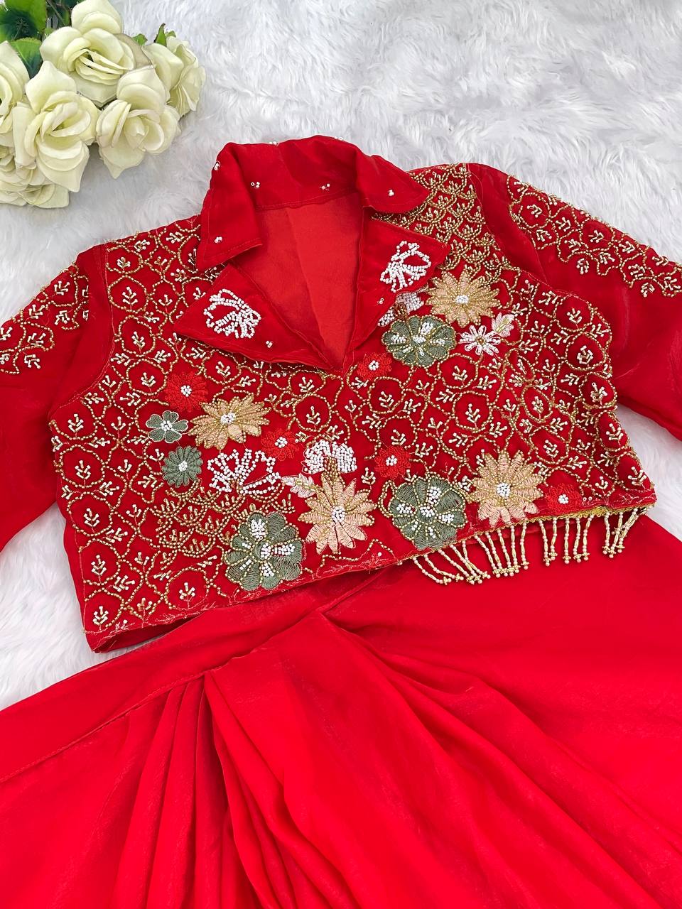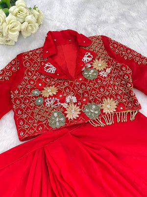 Red Color Embellished V Neck Dhoti Style Skirt