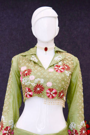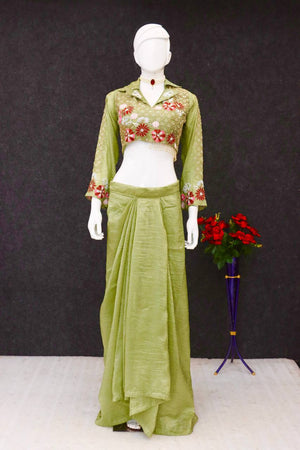 Pista Color Embellished V Neck Dhoti Style Skirt
