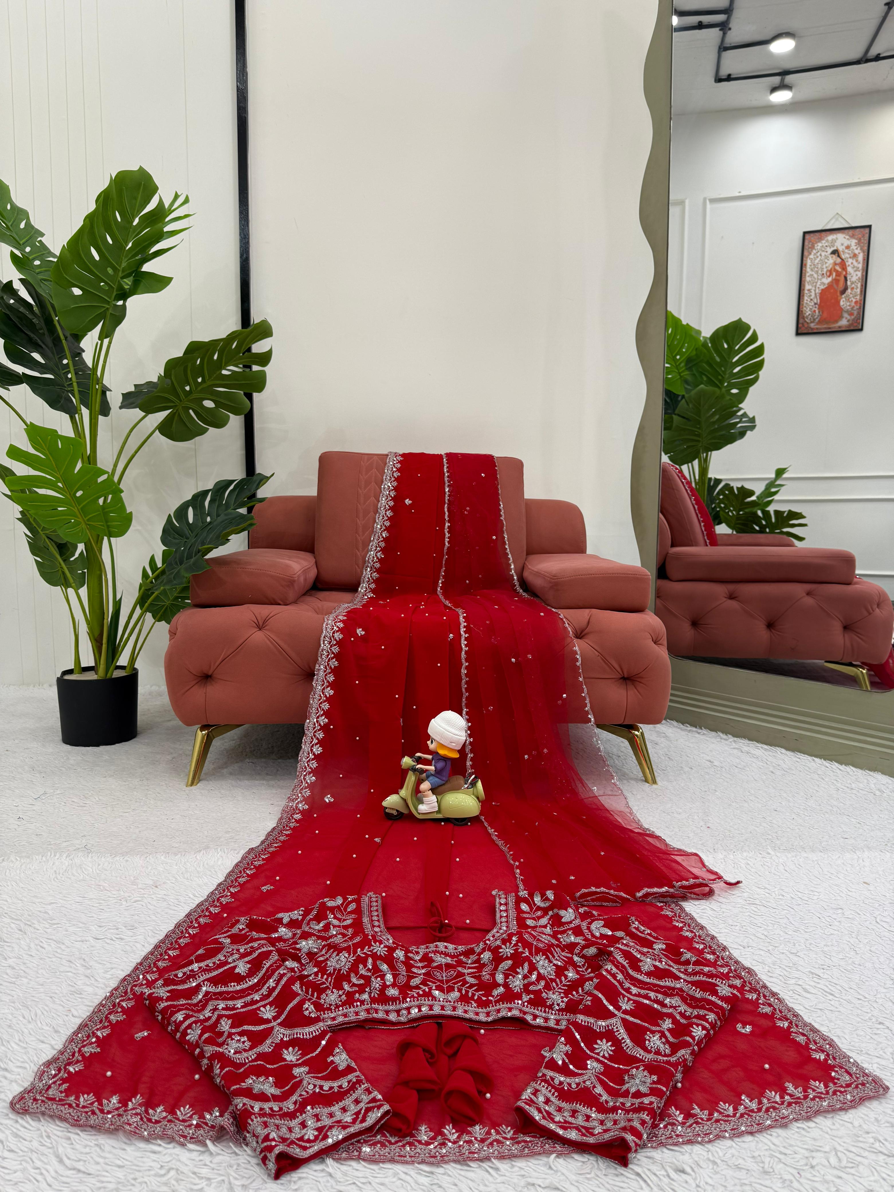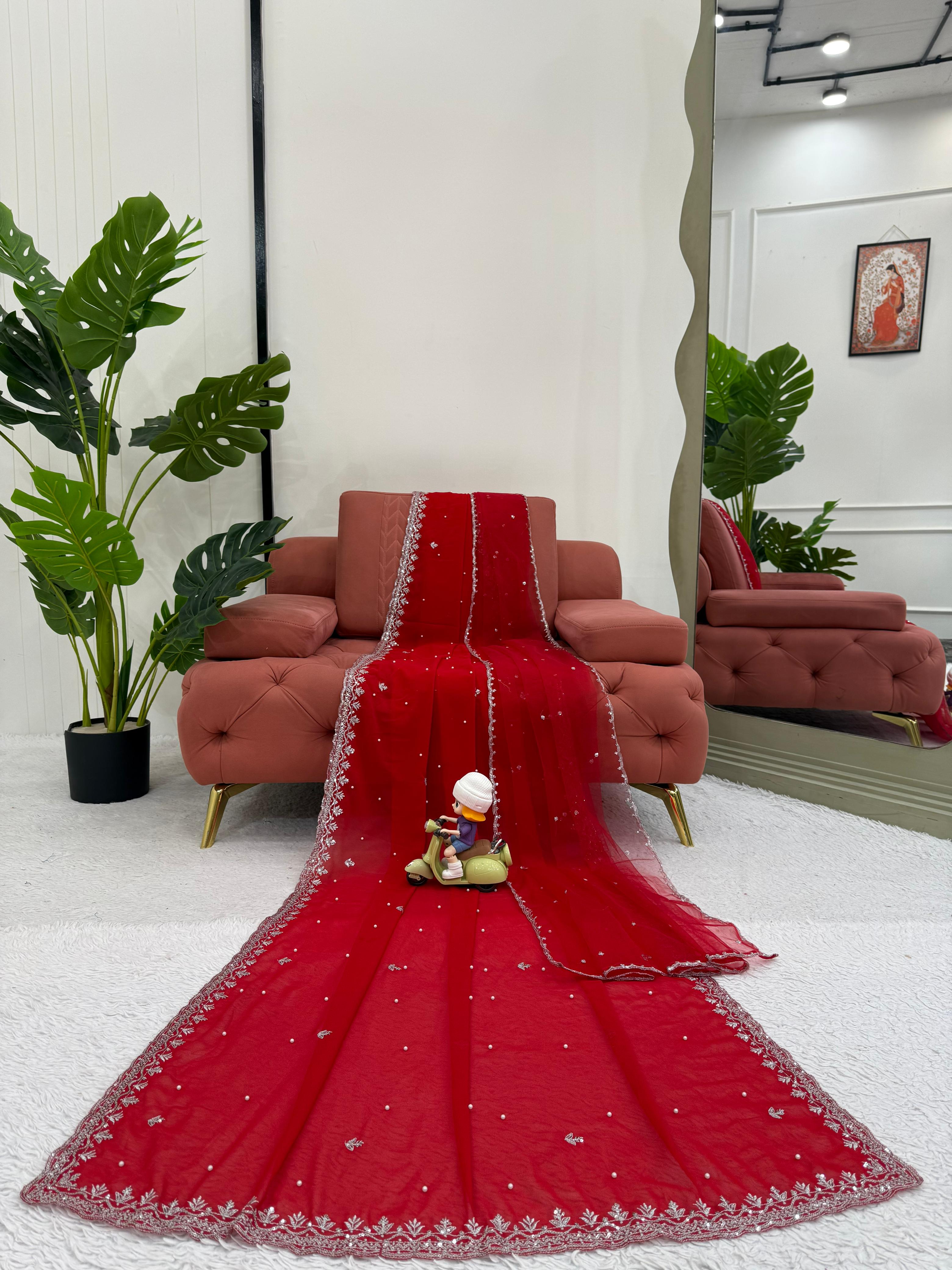 Sequence With Pearl Work Red Color Embellished Net Saree