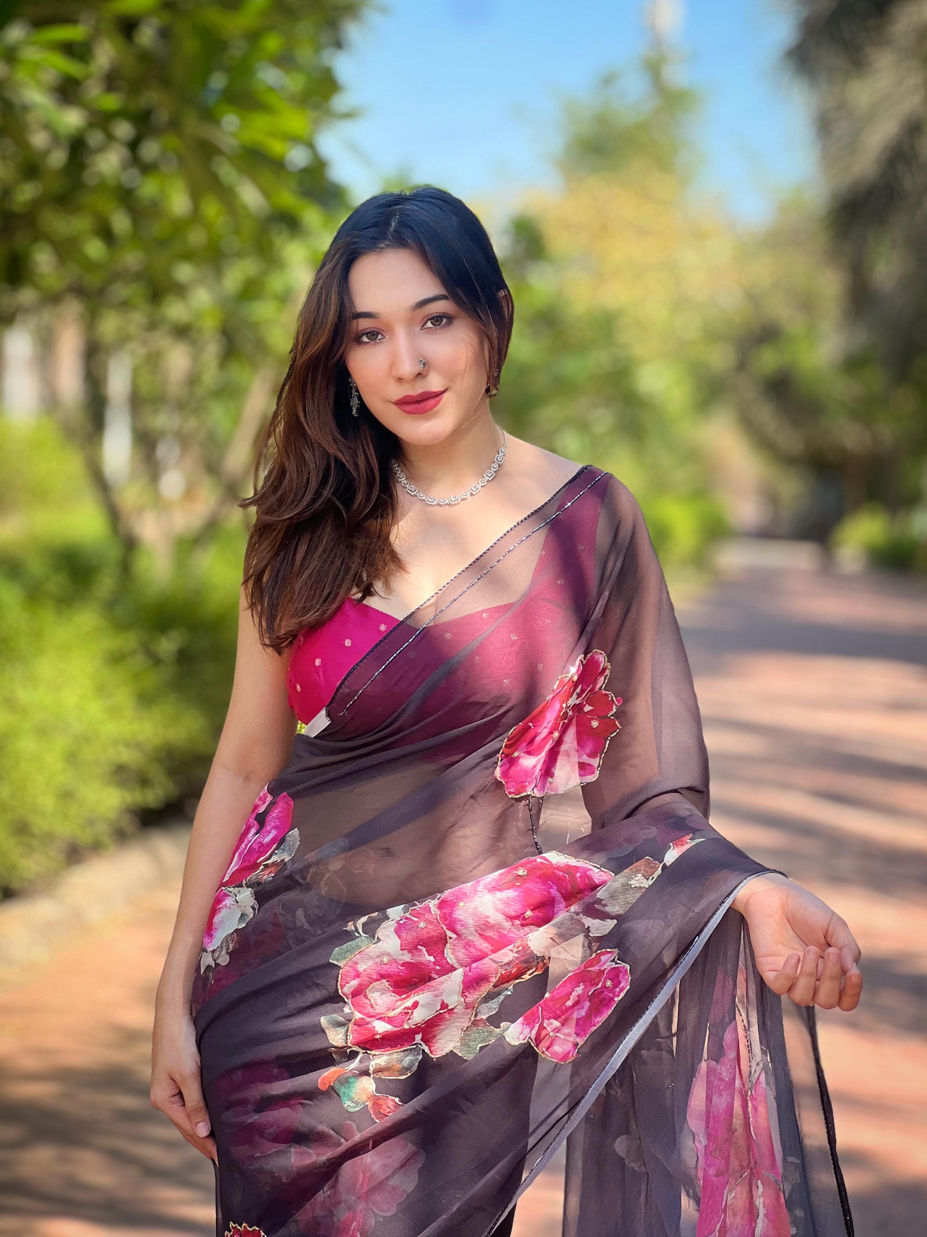 Saree: Premium Georgette Embellished With Beautiful Floral Print With Beautiful Handwork With Cut Dana And Pearl Work