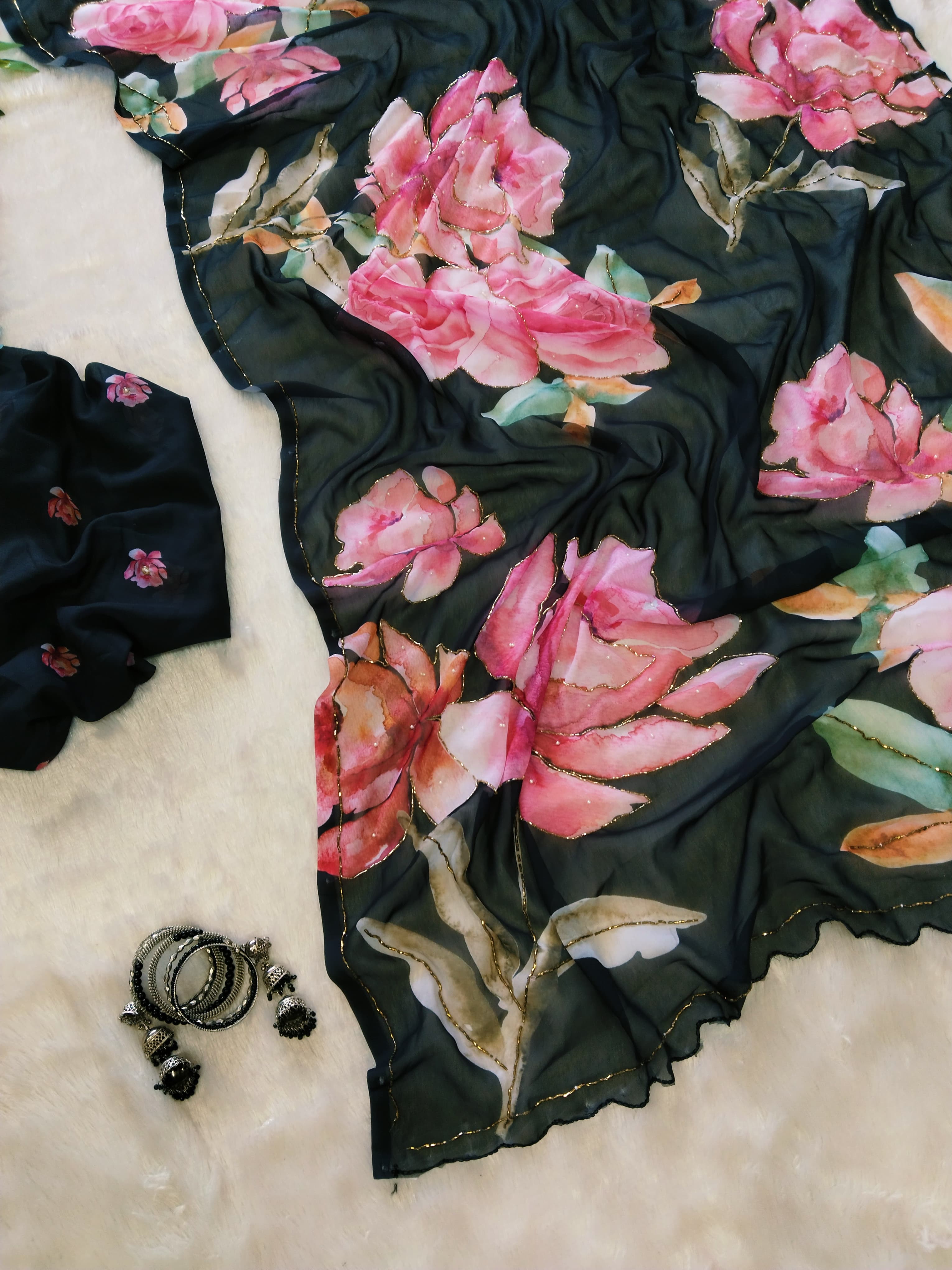 Blouse : Premium Georgette Embellished With Beautiful Floral Print With Heavy Handwork( Unstitched )