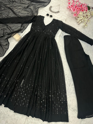 Shining Black Color Front Slit Sequence Work Palazzo Suit