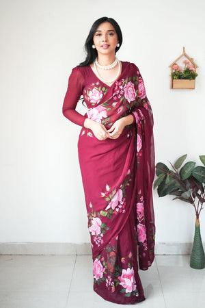 Shining Maroon Color Flower Design Ready To Wear Saree