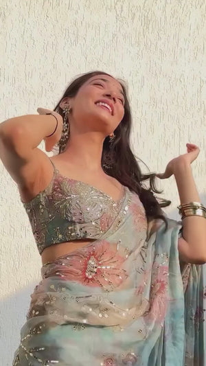 The saree comes paired with a matching Soft Tabby Silk printed blouse, beautifully detailed with stone and mirror work, allowing easy customization for a perfect fit.
