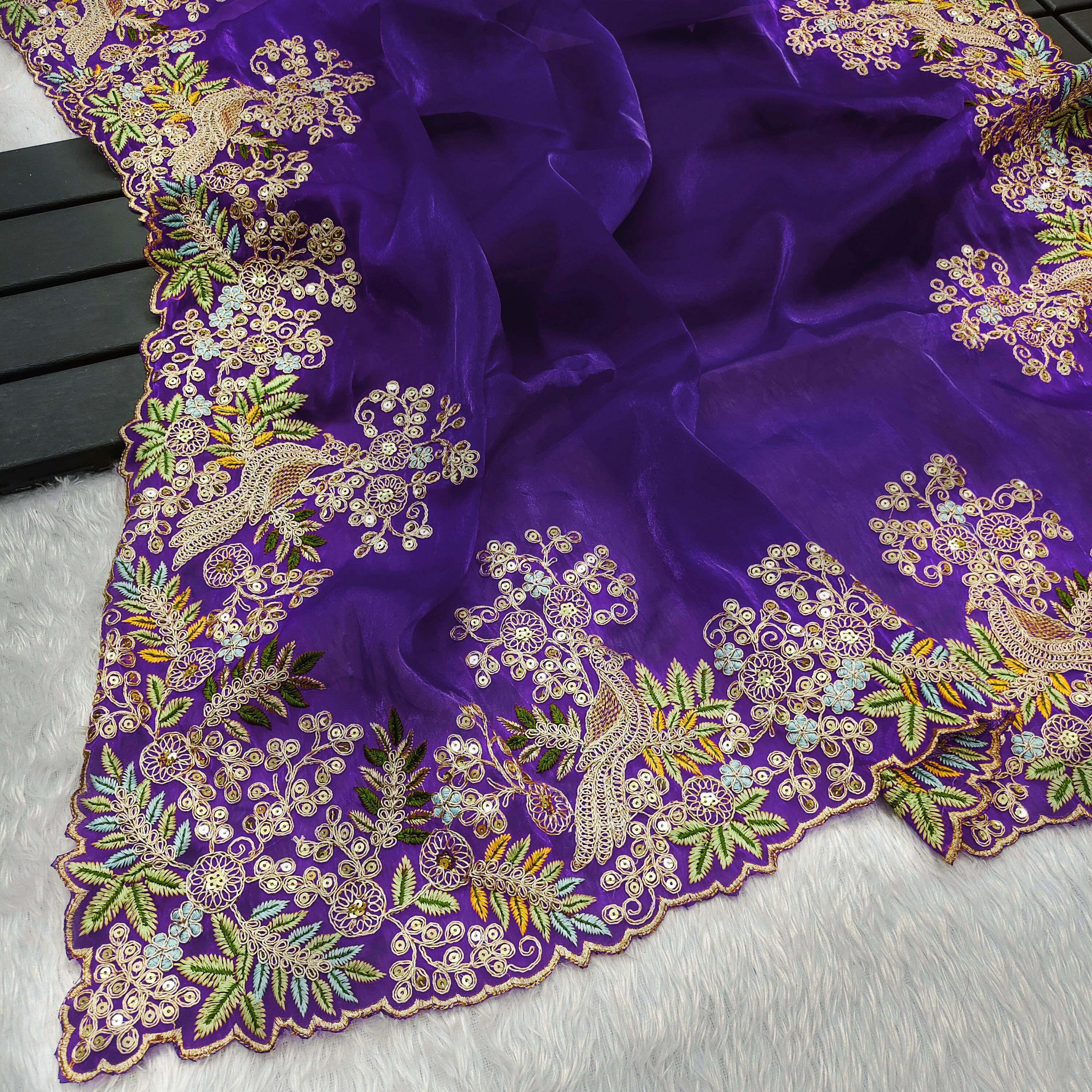 🥻 Sari Fabric : Pure Soft Jimmy Cho with Heavy Embroidery Multi Treads , Coding & Sequins 🧵Work & Fancy CutWork Border