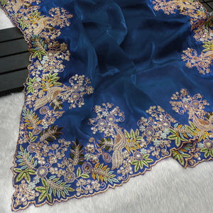 Traditional Wear Embroidery Work Teal Blue Color Saree