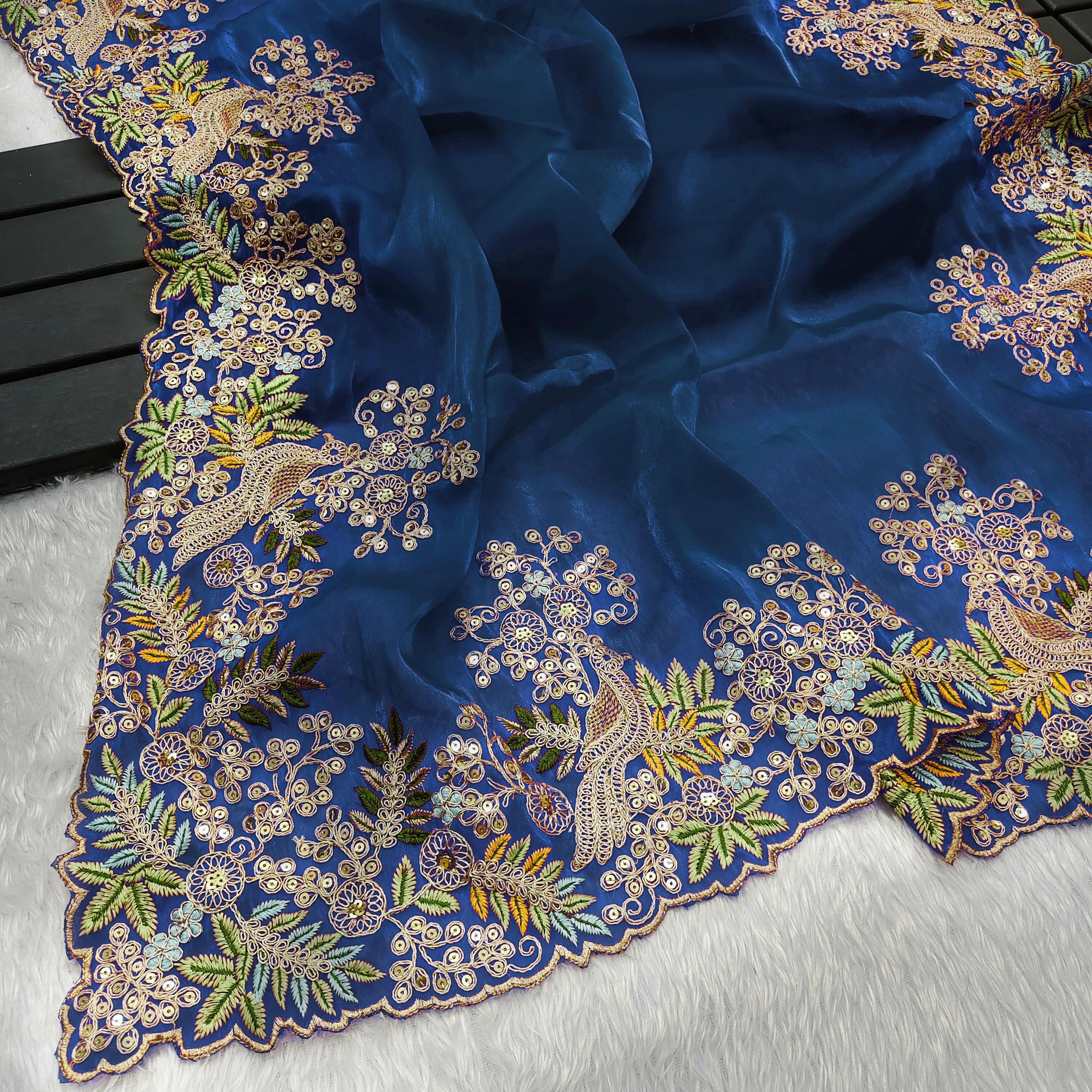 🥻 Sari Fabric : Pure Soft Jimmy Cho with Heavy Embroidery Multi Treads , Coding & Sequins 🧵Work & Fancy CutWork Border