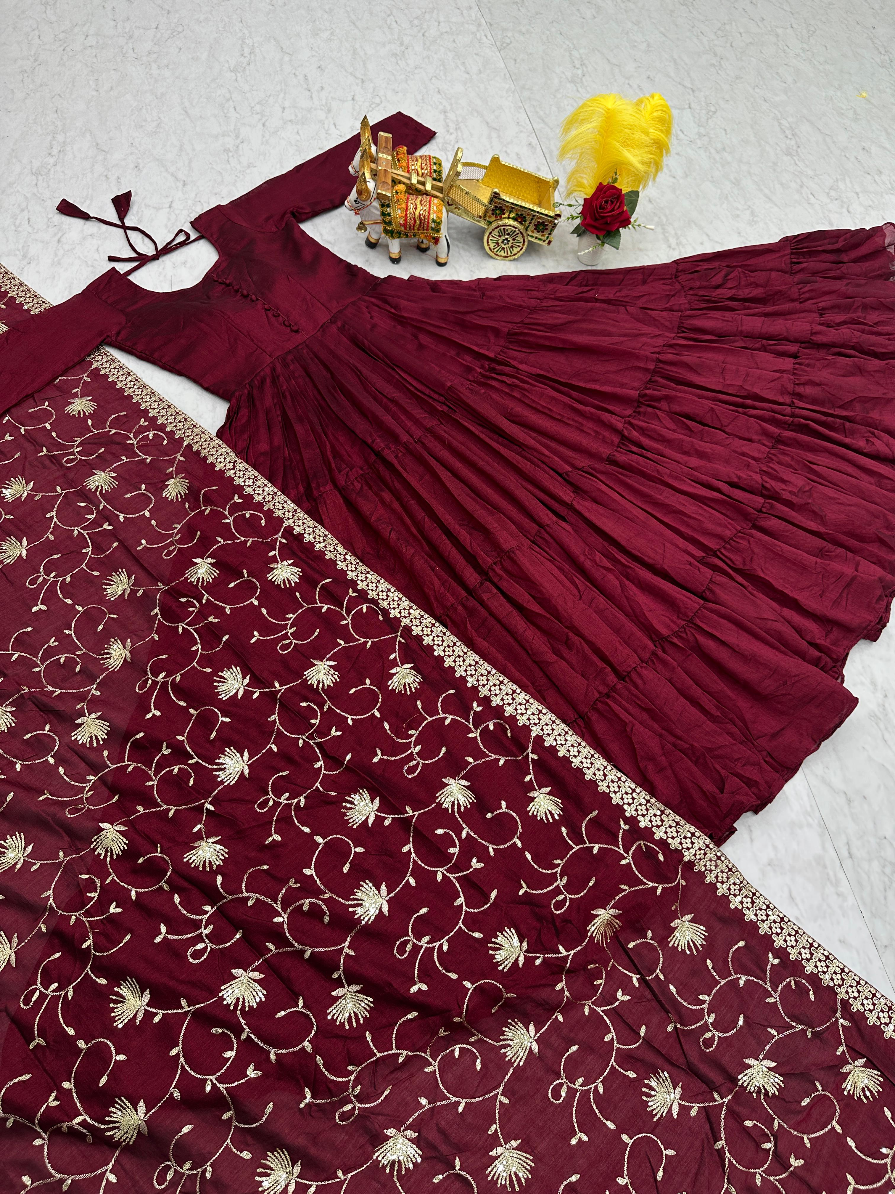 Traditional Wear Vichitra Silk Marron Color Gown