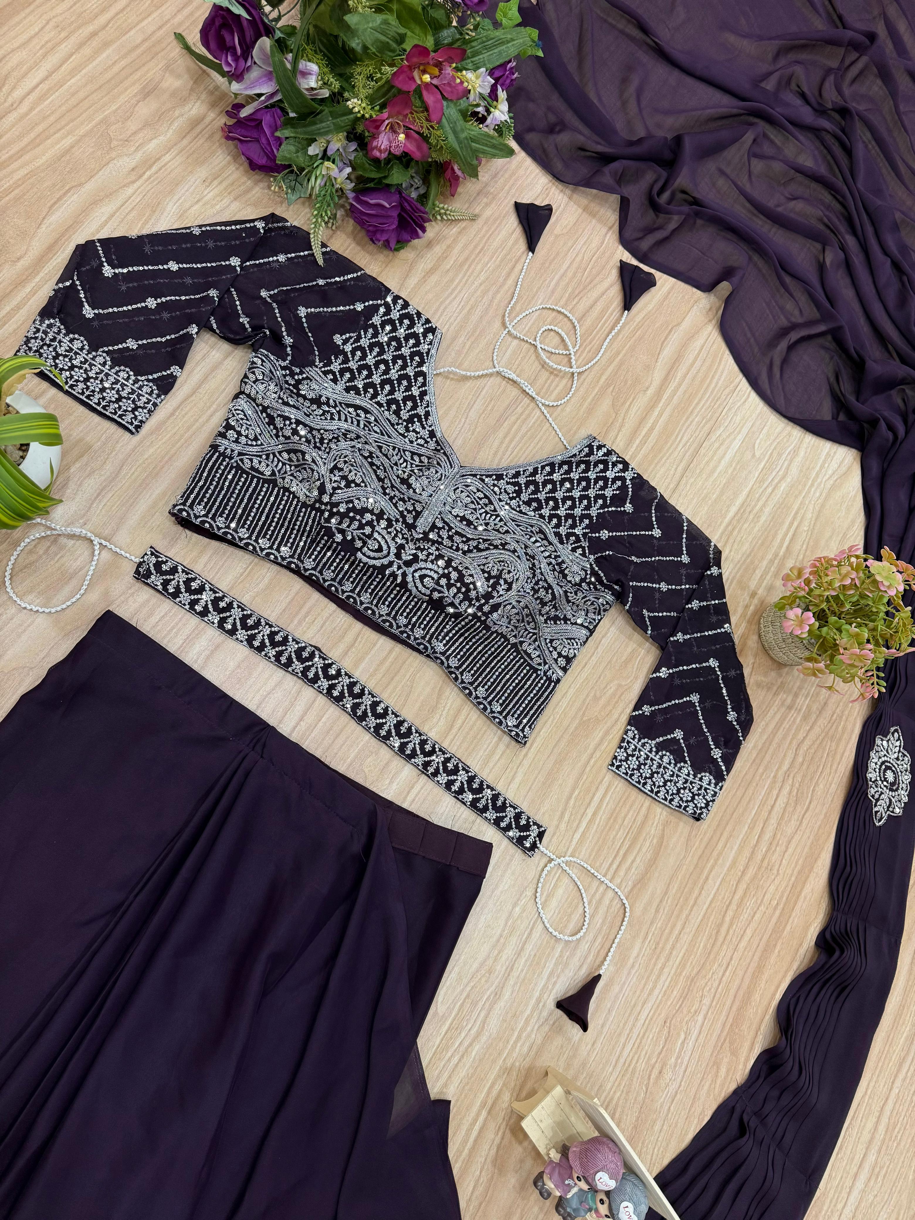 Wedding Wear Embroidery Work Purple Color Ready To Wear Saree